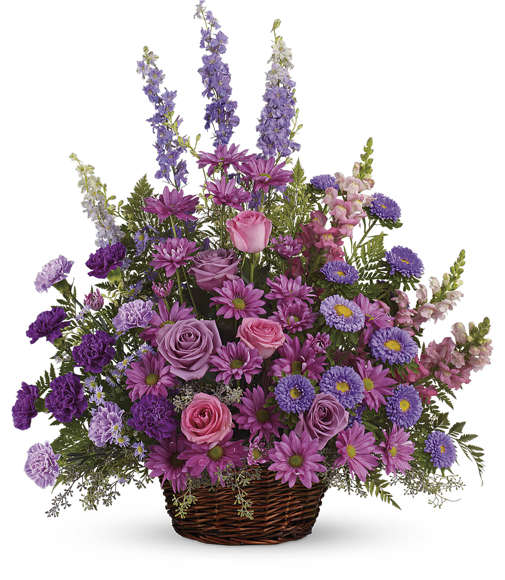Soothing lavender, respectful purple and compassionate pinks are combined beautifully in this basket overflowing with pretty flowers, sincerity and sympathy. A lovely way to share your thoughts and pay tribute to someone special.